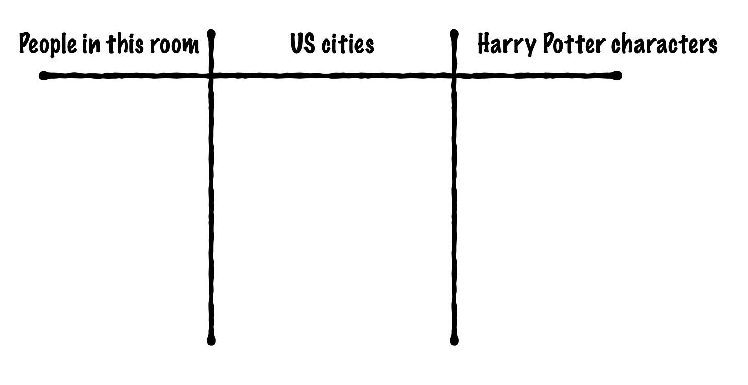Of course real work isn’t like that - we often have to keep entire plans and lists in our heads to determine what needs to happen next. So for this next exercise we are going to work with non-ordinal data. Try to choose data points that are equally accessible to the entire audience. For example:
